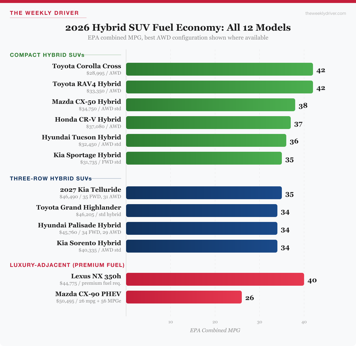 - Best value: 2026 Toyota Corolla Cross Hybrid. 42 mpg combined AWD for $28,995. Nothing else comes close on price.