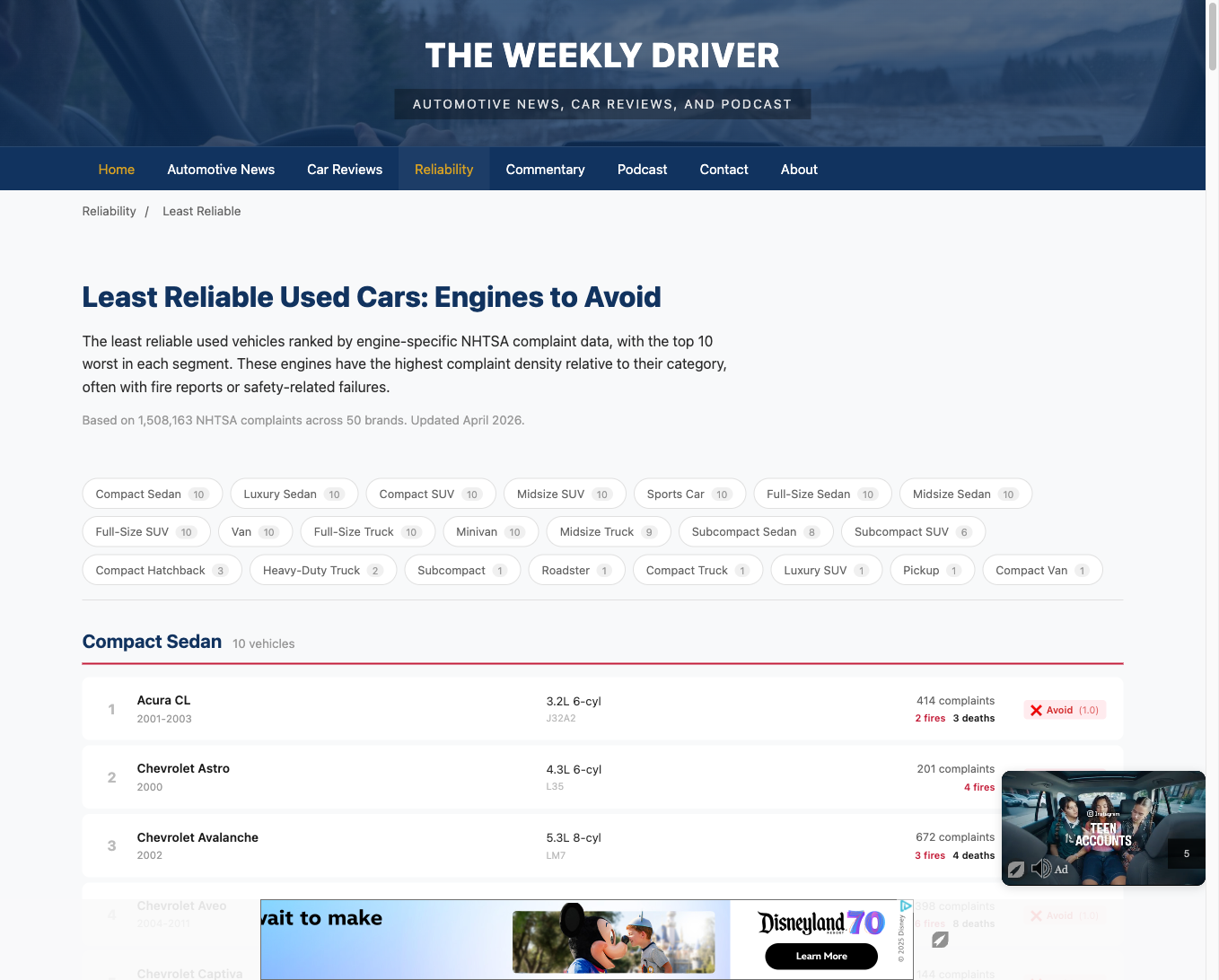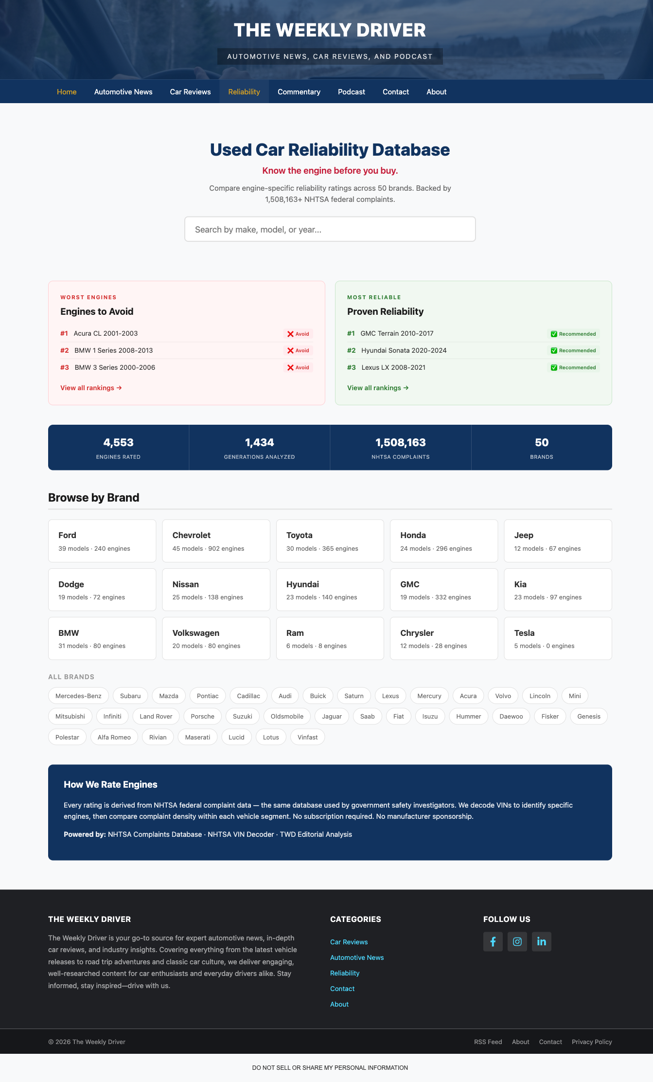 The Weekly Driver has launched a free engine-specific reliability database covering 4,553 engines across 50 brands, built entirely from 1,508,163 federal safety complaints filed with the National Highway Traffic Safety Administration. It is live now and open to anyone shopping for a used car. No subscription. No manufacturer sponsorship. No paywall.